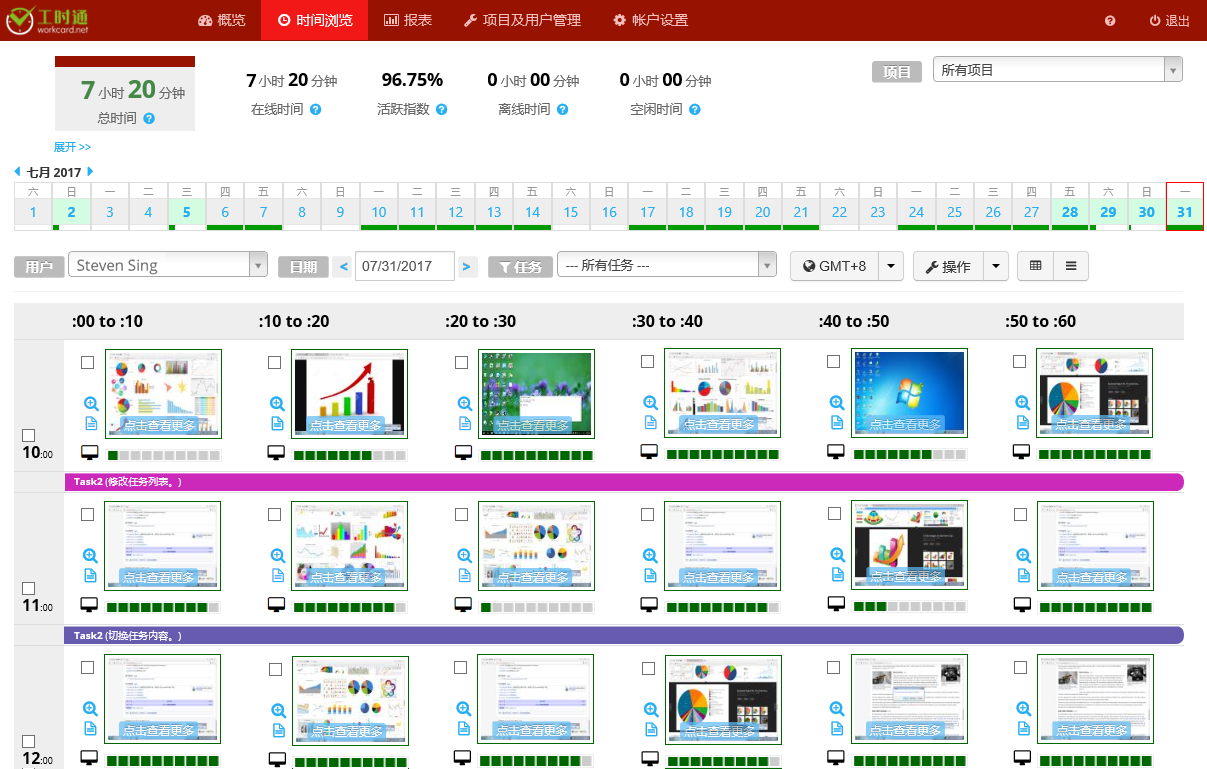 用户的工作时间,截屏,操作信息和工作内容动态会被自动上传,使您可以更直观简便地查看员工工作情况。