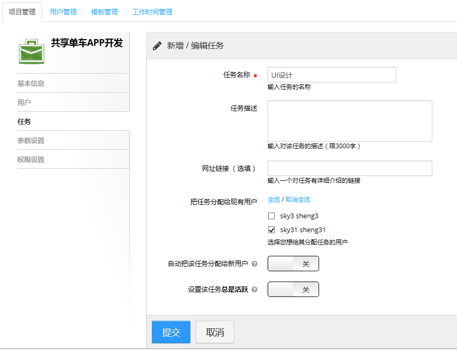 任务可以帮助您跟踪用户正在做的事情以及他们的时间用在哪些事情上。您可以分配不同的任务给不同的成员去完成。在「项目管理」页面,选择一个项目,点击「编辑」,然后在「任务」栏点击「创建新任务」就可以创建不同的任务。