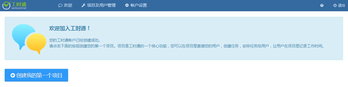在网站上使用注册的帐号登录之后,页面会提示「创建我的第一个项目」。项目是工时通的一个核心功能,您可以在项目中邀请您的用户,创建任务,安排任务给用户,让用户在项目里记录工作时间。