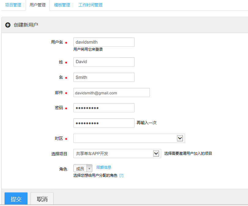 在真实的项目管理中我们需要记录的是其它成员的工作时间,所有需要为项目添加成员。我们可以在「用户管理」里创建或者邀请新用户加入这个项目。在添加用户时,我们可以设置这个用户是「成员」还是「管理员」角色。